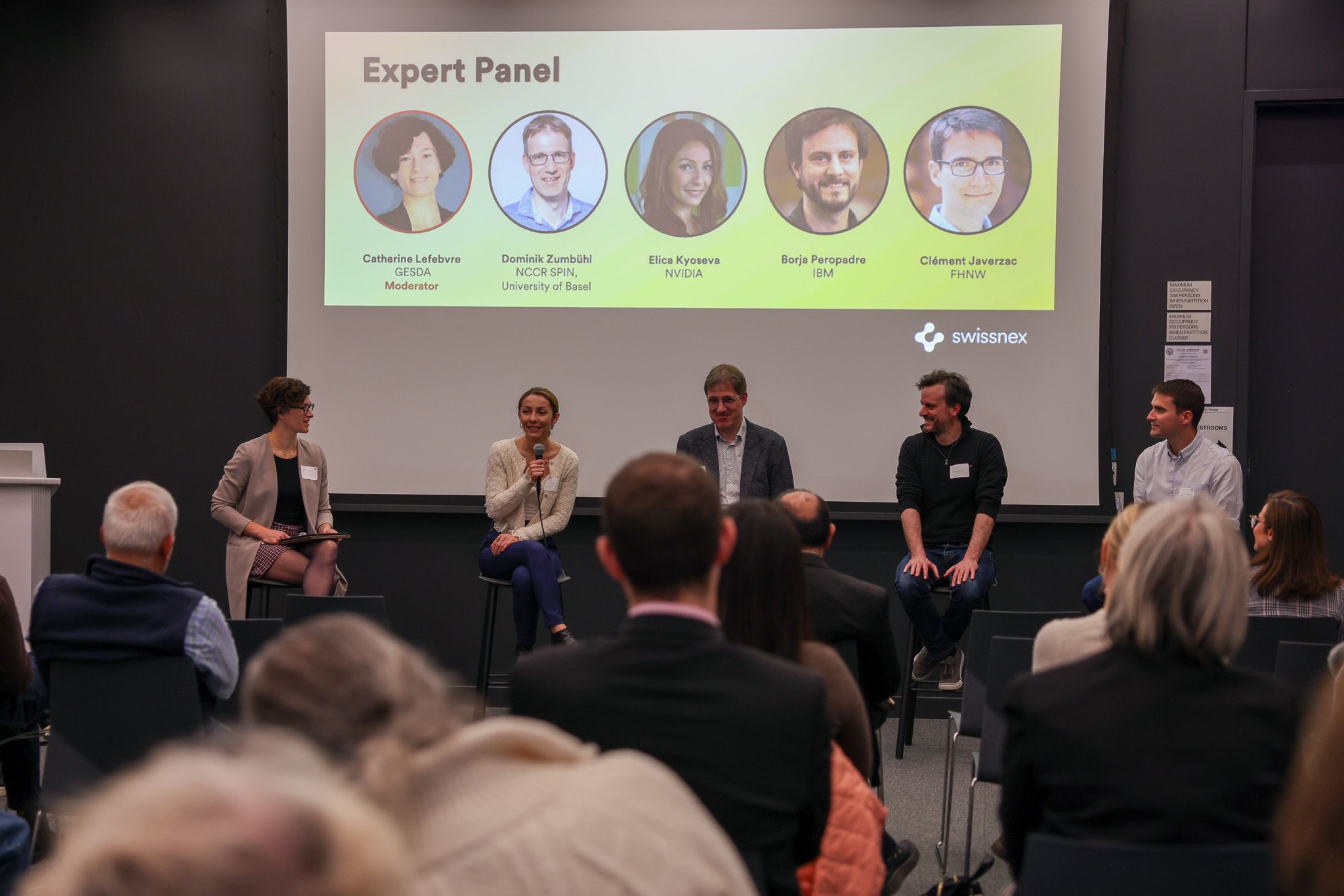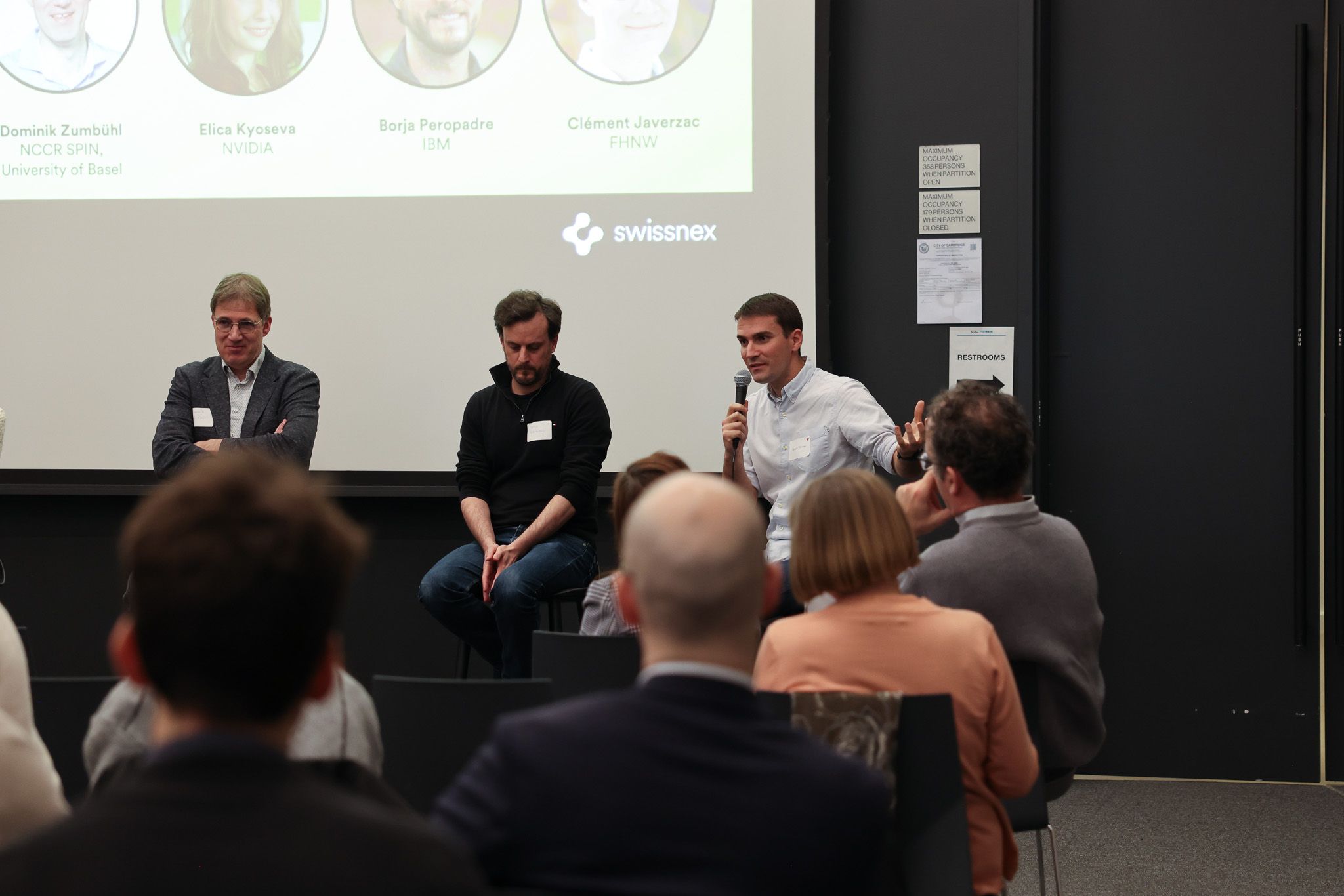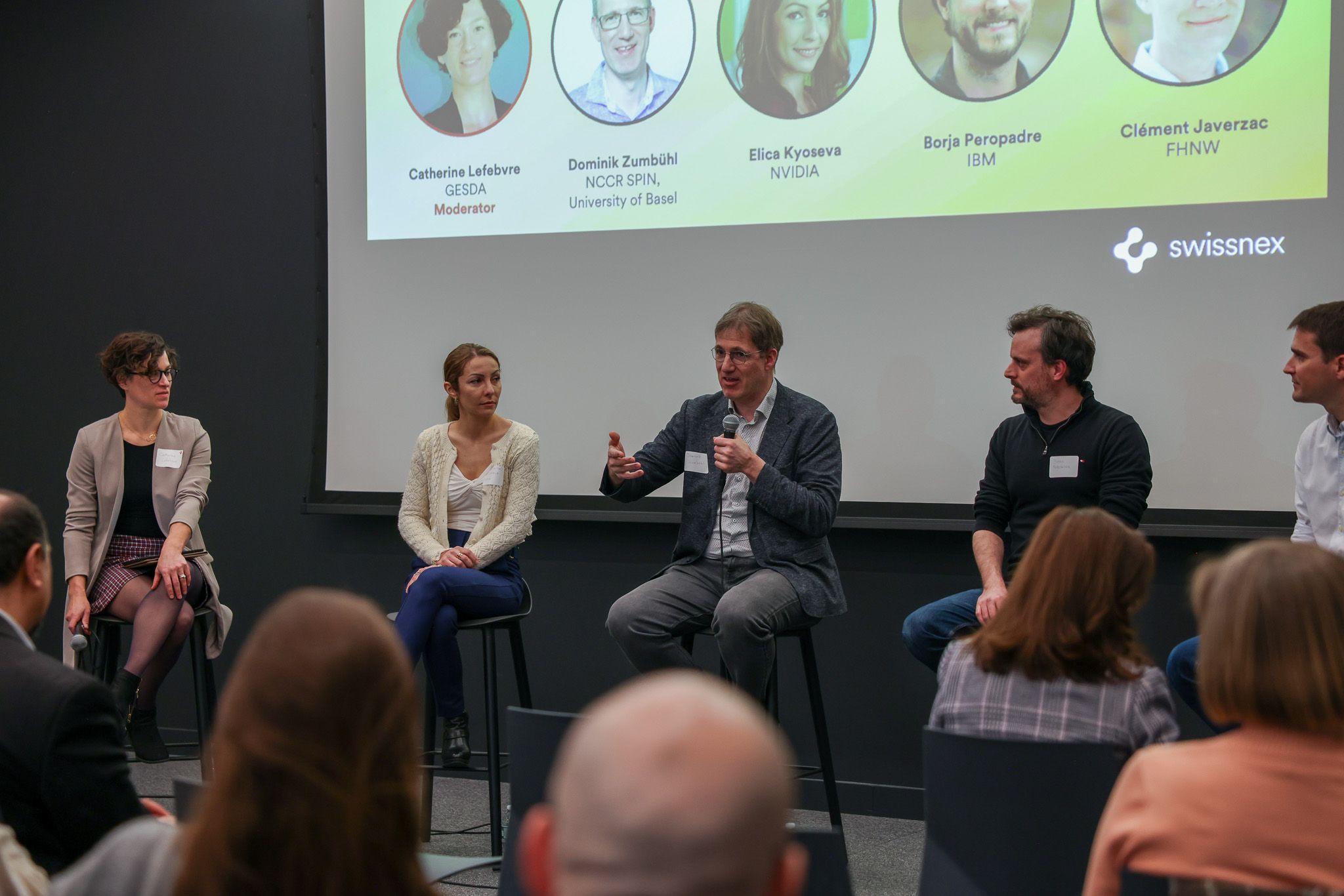During the event, Frederik Flöther from QuantumBasel and Yvonna Li from Roche delivered virtual talks on their own research. A panel discussion, moderated by Catherine Lefebvre from the Open Quantum Institute and GESDA, featured Dominik Zumbühl from the University of Basel and NCCR SPIN, and Clément Javerzac from the University of Applied Sciences and Arts Northwestern Switzerland to discuss research and education, with Borja Peropade from IBM and Elica Kyoseva from NVIDIA adding valuable industry insights.